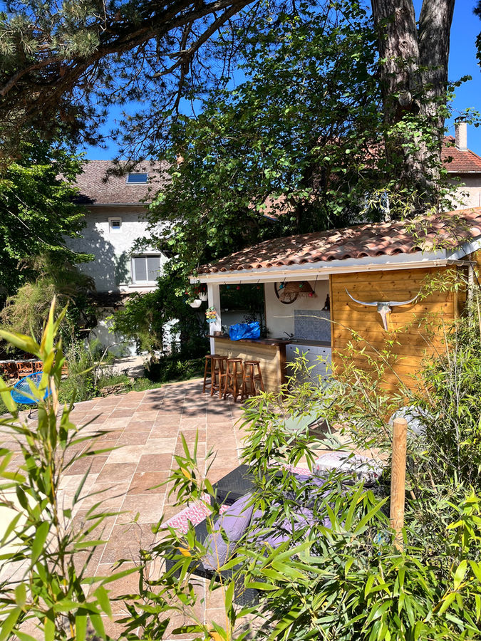 Aménagement complet des extérieurs d’une maison de caractère, avec la création d’un espace piscine pensé comme un véritable lieu de vie à part entière.